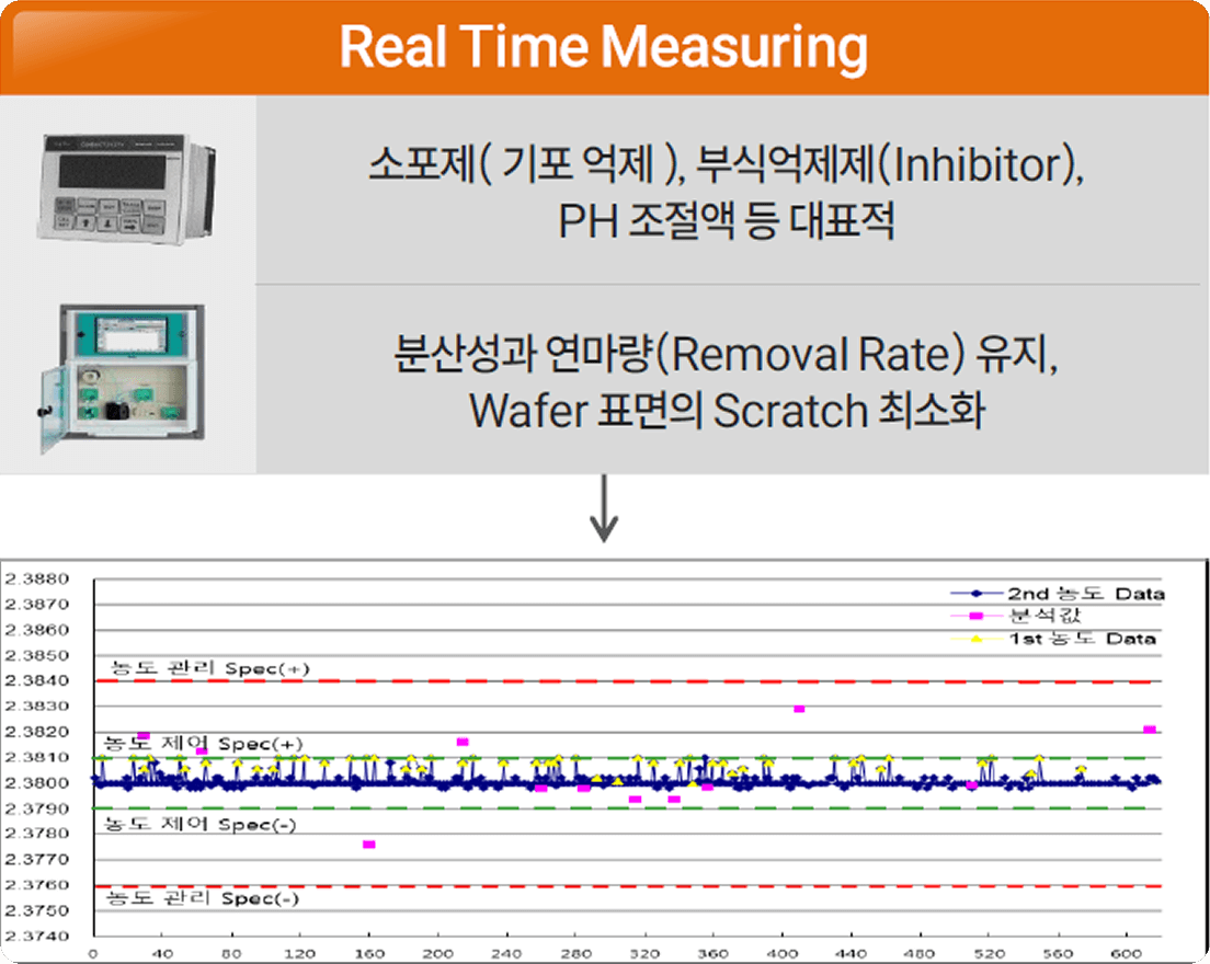 Electric-Sonic 기술을 통해 슬러리 입자의 안정성을 확보하고, Real Time Monitoring 시스템으로 공정 전반을 실시간으로 제어합니다.